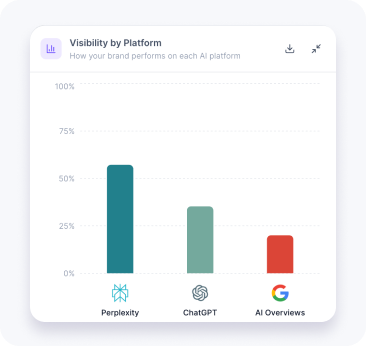 See how often ChatGPT, Perplexity, and Google AI Overviews recommend your brand. Get a visibility score from 0-100% based on real queries.