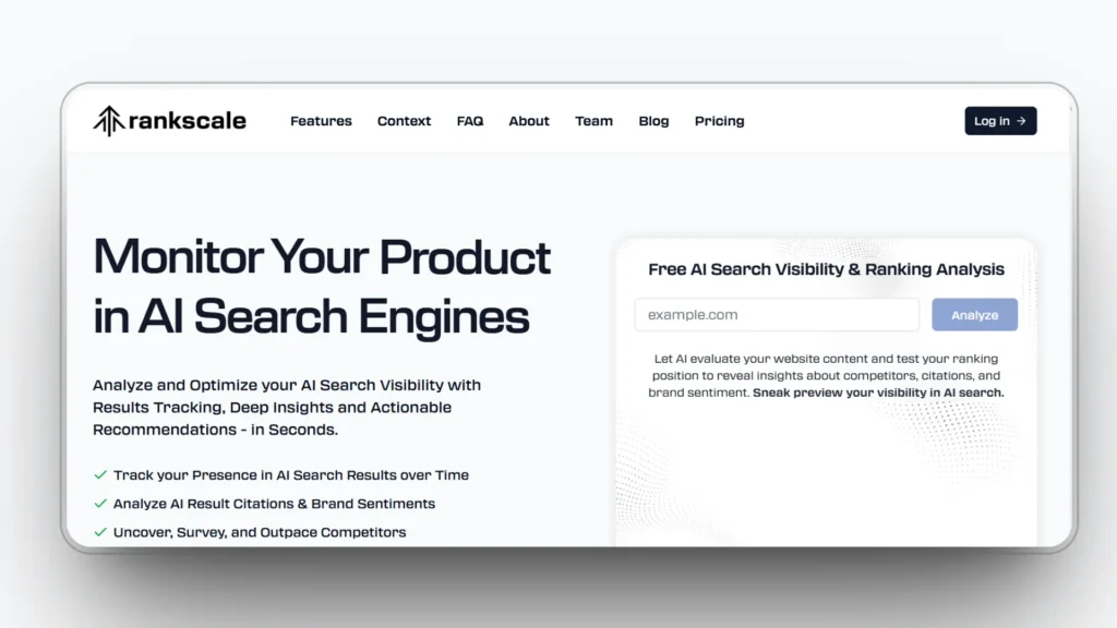 - Rankscale: Tracks brand mentions across answer engines with competitive comparisons.